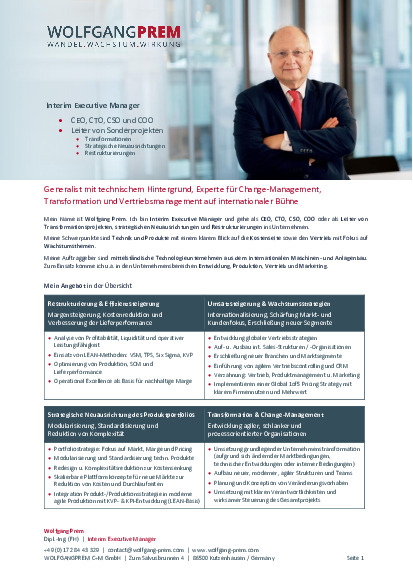- Ich bin Interim Executive Manager und gehe als CEO, CTO, CSO, COO oder als Leiter von Transformationsprojekten, strategischen Neuausrichtungen und Restrukturierungen ins Unternehmen.