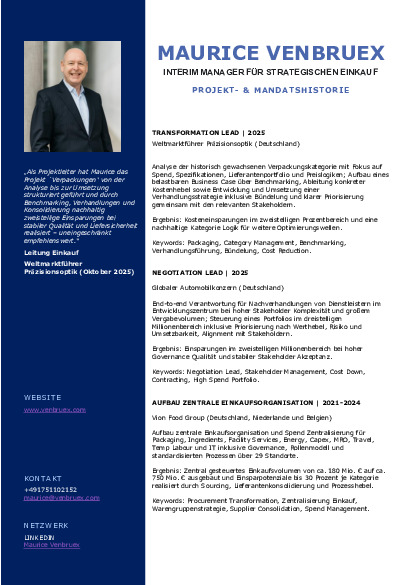 • Fast 30 Jahre Erfahrung in der Entwicklung und Umsetzung von Warengruppenstrategien, der Beschaffung in Best-Cost-Countries sowie im globalen Lieferantenmanagement mit Fokus auf nachhaltige Produkte und Dienstleistungen.