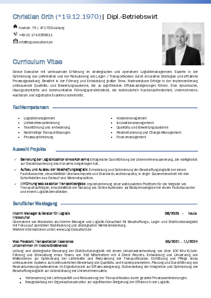 - Ihr Vorteil: Ich biete eine Kombination aus strategischer Weitsicht, operativer Umsetzung und empathischer Führung, um Ihre Logistik zu einem Wettbewerbsvorteil zu machen.