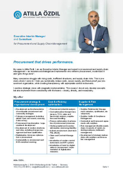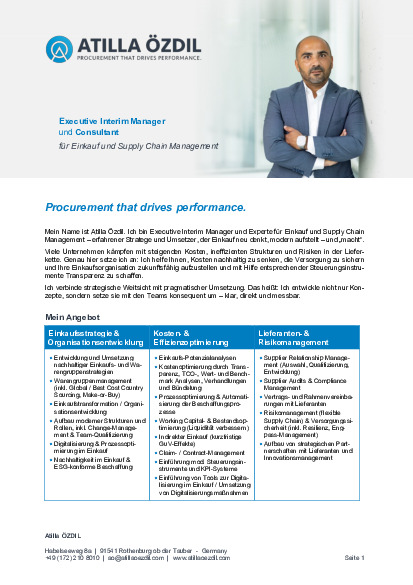 Viele Unternehmen kämpfen mit steigenden Kosten, ineffizienten Strukturen und Risiken in der Lieferkette. Genau hier setze ich an: Ich helfe Ihnen, Kosten nachhaltig zu senken, die Versorgung zu sichern und Ihre Einkaufsorganisation zukunftsfähig aufzustellen und mit Hilfe entsprechender Steuerungsinstrumente Transparenz zu schaffen.