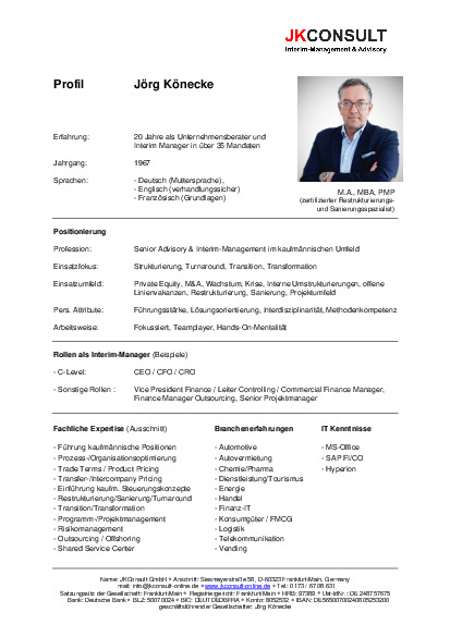 - M&A/Carve Out/Post Merger Integration/Due Diligence/Business Plan/Finanzierungen