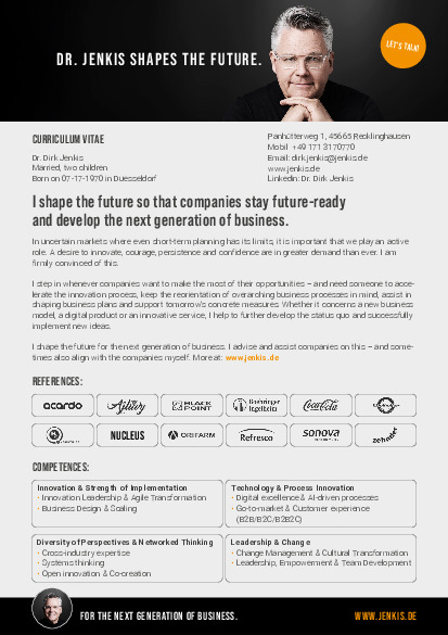 Ich komme ins Spiel, wenn Unternehmen ihre Chancen nutzen wollen – und jemanden brauchen, der Innovationsprozesse beschleunigt, die Neuausrichtung bereichsübergreifender Geschäftsprozesse mitdenkt, Businesspläne mitgestaltet und konkrete Maßnahmen von morgen mitträgt. Ob neues Geschäftsmodell, digitales Produkt oder innovativer Service – ich helfe, Bestehendes weiterzuentwickeln und Neues erfolgreich umzusetzen.